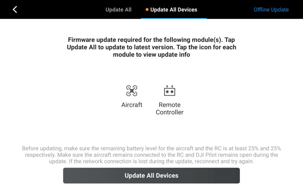 Włącz drona oraz aparaturę sterującą. Upewnij się, że jesteś zalogowany do swojego konta DJI klikając w ikonę postaci w lewym górnym rogu. Na pierwszej stronie aplikacji po połączeniu z dronem oraz udostępnieniu WIFI sprawdź możliwość aktualizacji wchodząc w napis w prawym górnym rogu. Następnie wybierz zakładkę Firmware i uaktualnij wszystkie urządzenia do najnowszej wersji oprogramowania. Aktualizacja może trwać około 30 minut.